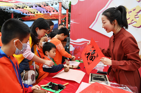 11月21日,两岸青少年在木刻拓印摊位上学习传统拓印技艺。当天,两岸青少年木偶研学营在福州开营,邀请泉州、漳州及台湾等地木偶剧团,以展览展演、授课、参访等方式,为两岸青少年举办研学交流活动。新华社记者 魏培全/摄