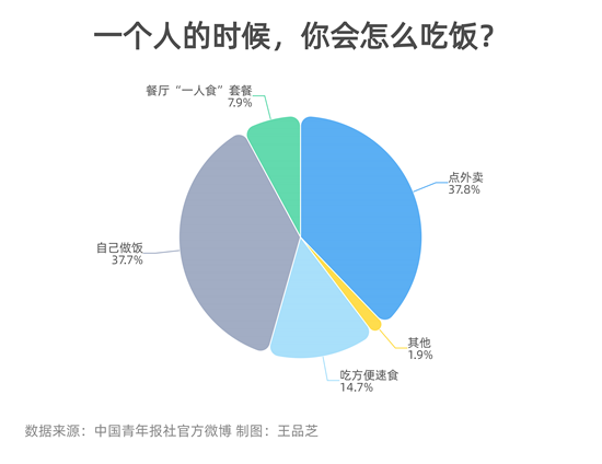 日前,中国青年报社社会调查中心在中青报官微发起一项“一个人的时候,你会怎么吃饭”的投票,2304名微博用户参与。数据显示,一个人的时候,37.8%的受访者选择点外卖,37.7%的受访者会自己做饭。