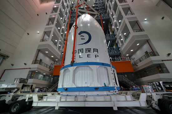 长征五号遥五火箭整流罩,上面的“中国探月”4个大字清晰可见。都鑫鑫/摄