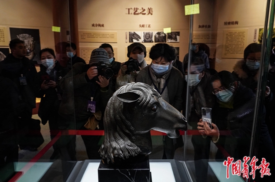 12月1日,北京圆明园正觉寺文殊亭内,记者围着流失海外百余年的马首铜像拍照。当日,“圆明园马首铜像划拨入藏仪式”在圆明园正觉寺举行,马首铜像成为第一件回归圆明园的流失海外重要文物,《百年梦圆——圆明园马首铜像回归展》同时开展。 中青报·中青网记者 王嘉兴/摄