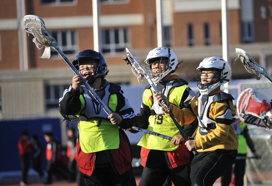 棍网球是一种使用杆顶带有网袋的球杆作为持球工具的团队球类运动,利用杆顶的网袋控制小球,结合足球、篮球以及曲棍球特点于一体,考验运动员的手脚协调性以及团队合作能力。 王立群/摄(新华社发)