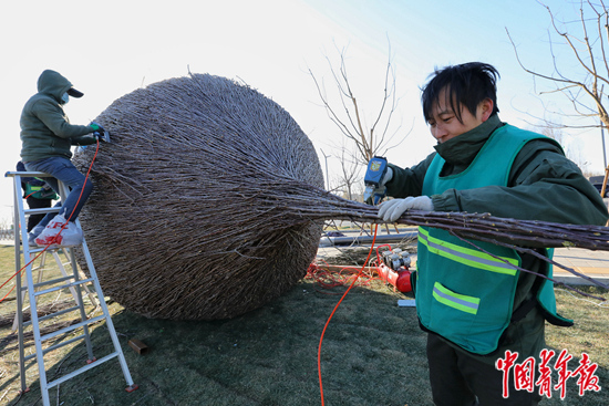 当日,由北京市园林绿化局、市总工会联合举办,丰台区总工会和北京花乡花木集团承办的2020年北京市“职工技协杯”绿化环保花艺师职业技能大赛暨第三届北京地景设计艺术节完成作品制作,49件地景艺术作品分别在绿心公园和世界花卉大观园亮相。落叶、枯枝、麻绳……这些废弃物经过园艺师的巧手,成为冬日城市的风景,让市民在萧索的冬季也能够感受到别样之美。中青报·中青网记者 李建泉/摄