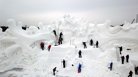 12月10日,雪雕师在太阳岛“雪博会”园区进行雪雕制作(无人机照片)。
