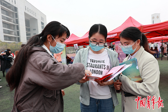 12月13日,由团中央青年发展部、团广西区委、广西学联、智联招聘主办的2021届“千校万岗·就业有位来”广西高校毕业生秋季线下双选会,在广西财经学院相思湖校区举办。招聘会吸引了广西200余家知名优质企业入校揽才,招聘职位上千个,招聘人数达13568人。本次双选会旨在促进高校毕业生尤其是2021届建档立卡贫困家庭毕业生更好更快就业。 中青报·中青网记者 谢洋/摄