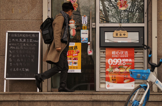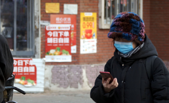 12月19日,天津,一拿手机的市民从超市前社区团购宣传海报旁走过。