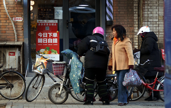 12月9日,天津,和平区一市民在阅读社区团购的海报。