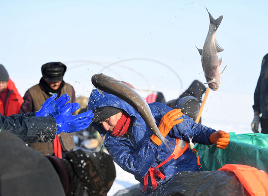 12月27日,渔工们在乌伦古湖挑选捕到的鱼。新疆阿勒泰地区福海县乌伦古湖每年12月中下旬进入“冬捕”季。乌伦古湖是中国十大内陆淡水湖之一,冬季冰上大拉网捕鱼是乌伦古湖的传统捕鱼方式,场面壮观。 新华社记者 沙达提/摄
