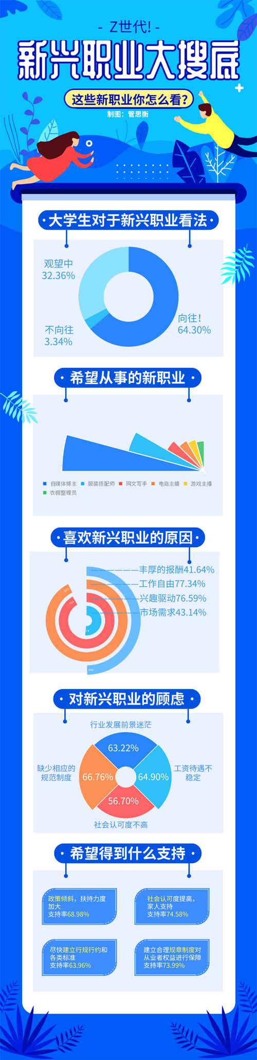 相比令自己内心“蠢蠢欲动”的新兴职业,正面临就业压力的黄潇蓓还是倾向于选择传统的工作。“新兴职业可以是我的副业。想要通过新兴职业实现自己的物质基础并非易事。”据她了解,在她比较想从事的自媒体博主职业,很难依靠一个人的力量获得成功,有专业的团队、平台,结合有效的运营配合才有可能获得成功。