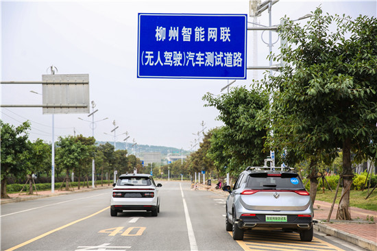 在位于广西柳州的智能网联(无人驾驶)汽车测试道路上,两辆新宝骏智能网联测试车正进行自动驾驶测试。
