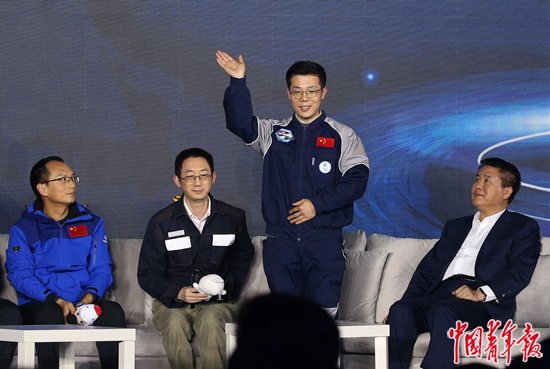 2020年12月26日,第五届“中国制造日”全国主会场活动“大国重器”板块圆桌论坛上,中国科学院声学研究所工程师、“奋斗者”号海试队员廖佳伟起身与大家打招呼。中青报·中青网记者 陈剑/摄