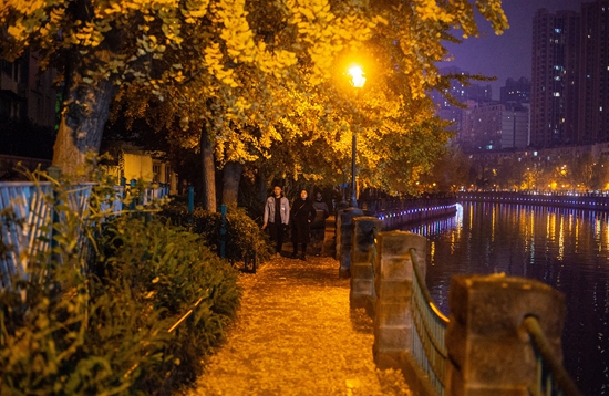 2019年,成都,“银杏大道”锦里中路。在路灯映照下,银杏显得更加金黄迷人。视觉中国供图