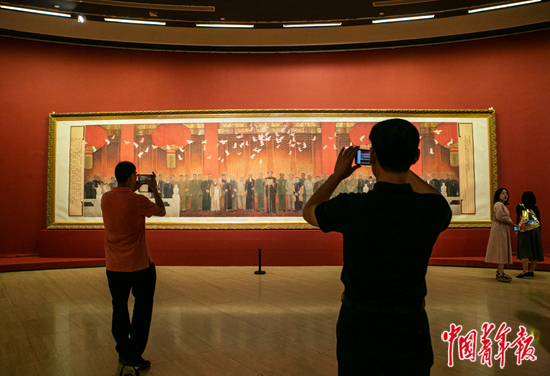 2019年9月26日,中国美术馆,“伟大历程 壮丽画卷——庆祝中华人民共和国成立70周年美术作品展”上,观众在开国大典题材的画作前驻足拍摄。 中青报·中青网记者 曲俊燕/摄