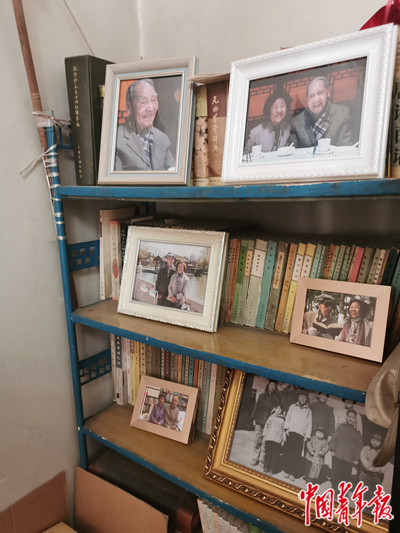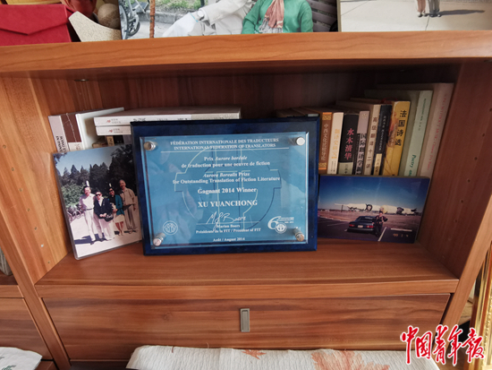 许渊冲的书架上放满了相框,全是与妻子照君的合影、全家福。唯一的“外人”是杨振宁,他和杨振宁的合影,摆在他的“北极光”奖牌旁边。