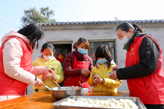 当日,安徽省滁州市来安县施官镇巾帼志愿者与留守儿童一起写福字、贴窗花、包饺子,喜迎新春。春节临近,针对许多在外务工人员响应号召留在异地过年,安徽多措并举做好留守儿童关爱工作,让孩子们感受家的温暖。新华社记者 曹力/摄