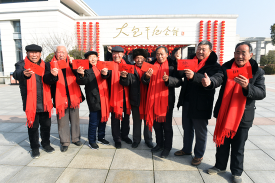 2月3日,在凤阳县小岗村,8位“大包干”带头人在大包干纪念馆前展示自家领取的分红红包。当天,“中国农村改革第一村”安徽省凤阳县小岗村迎来第四次集体经济收益股权分红,作为村集体经济股份合作社的股东,小岗村村民每人喜提600元“红包”。新华社记者 周牧/摄