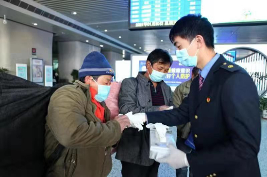 铁路常州站开展“防疫有我,健康同行”志愿服务活动,组织铁路工作人员和青年志愿者等向候车旅客、到站旅客发放医用口罩、防疫宣传手册、一次性橡胶手套以及窗花、春联等,落实春运出行疫情防控措施。史康/摄