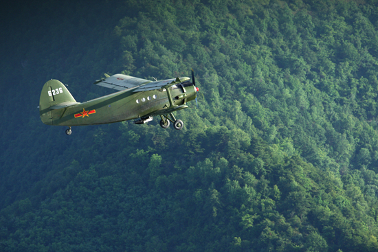 空军某运输搜救团一大队飞行员驾驶运-5飞机飞越秦岭播区,察看飞播成果。张树华/摄