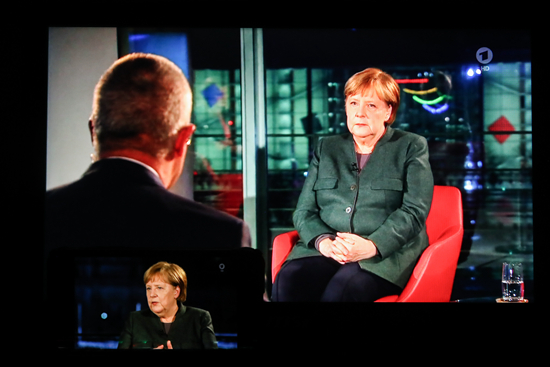 这是2月2日在德国首都柏林拍摄的德国总理默克尔参加德国电视一台一档访谈节目的视频画面。