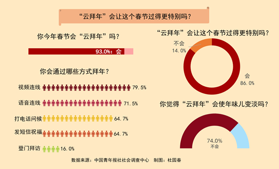 上周,中国青年报社社会调查中心联合问卷网(wenjuan.com),对2013名受访者进行的一项调查显示,93.0%的受访者今年春节会“云拜年”,视频连线、语音连线是主要的“云拜年”形式。86.0%的受访者表示“云拜年”会让这个春节过得更特别。