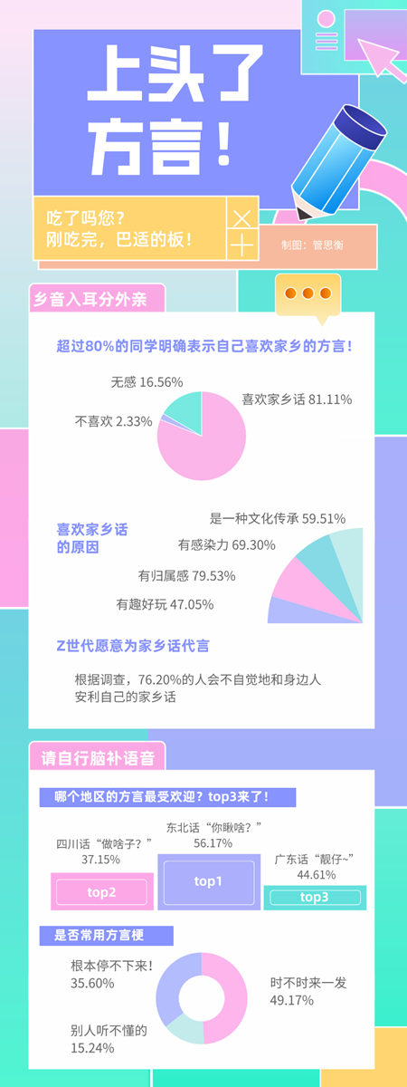 近日,中青校媒面向全国900名高校学生就方言话题展开问卷调查,结果显示,92.11%被调查者会说方言,方言以其有趣、好玩的特性(47.05%),自带的归属感、亲切感(79.53%),浓厚的感染力(69.30%)和利于家乡文化传承(59.51%)等原因,“俘获”了81.11%Z世代的芳心。其中,东北话、四川话、广东话在“最受欢迎的方言”排行榜中位列前三。