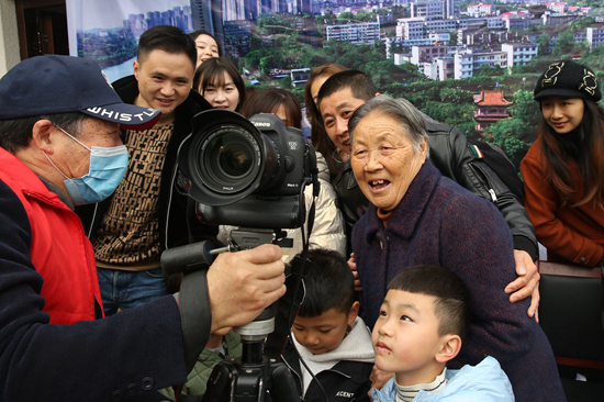 2月8日,在四川省内江市东兴区白合镇丈雪村,当地摄影家协会的摄影师为村民免费拍摄全家福照片。