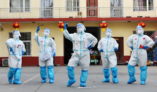 2月7日,位于石家庄长安区的一家隔离酒店,医护人员用特有的方式为即将解除隔离返家过年的人员加油。任全军/人民视觉