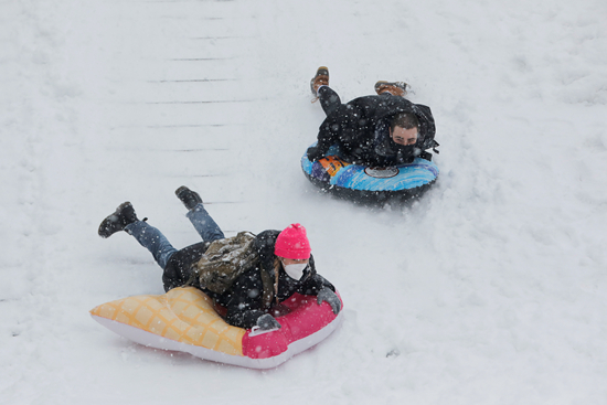 2月7日,在美国纽约中央公园,游客在积雪的台阶上玩耍。新华社/路透
