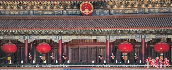 重达487公斤的金属国徽悬挂在天安门城楼上熠熠生辉