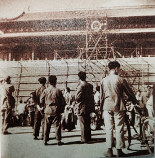 1950年9月30日,这枚重达487公斤的金属国徽悬挂在北京天安门城楼上。辽宁省委党史研究室供图