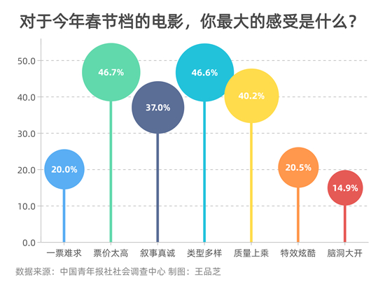 对于今年春节档电影,大家最大的感受是类型多样(46.6%)、质量上乘(40.2%)和叙事真诚(37.0%),还有特效炫酷(20.5%)、脑洞大开(14.9%)等。