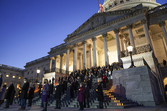 当地时间2月23日,在美国华盛顿国会大厦外,参众两院两党议员为新冠肺炎病亡者举行烛光守夜活动。新冠肺炎疫情发生以来,美国因感染新冠肺炎病亡者已达50万。视觉中国供图