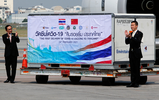 2月24日,泰国曼谷,泰国总理巴育和中国驻泰国大使馆公使衔参赞杨欣抵达接机现场。当日,泰国政府采购的中国科兴新冠疫苗运抵曼谷。截至目前,中方向巴基斯坦等53个发展中国家提供了疫苗援助,已经并正在向22个国家出口疫苗。中国疫苗受到越来越多国家的肯定和欢迎。视觉中国供图
