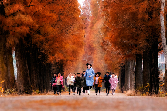 2020年12月15日,江西省广丰区王洋村一个完小的师生在校门外跑步。