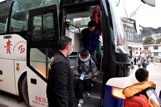 学生到达学校后有序下车(3月1日摄)。贵阳市为解决部分农村地区学生出行难问题,于3月1日正式开通运营农村学校专项运输车。这一探索在全省率先引进有资质的市场化客运公司,通过政府补贴、全程监管,鼓励企业将空闲的客车跑起来,专车专营,定时、定点、定线用于接送学生。骆娅/摄(新华社发)