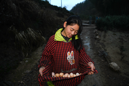 张志菊从自家农场捡回鸡蛋(2月25日摄)。
