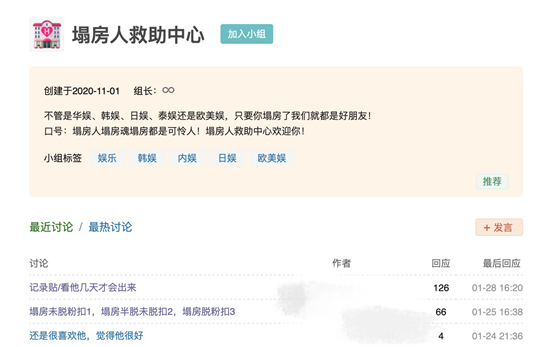 在追星女孩活跃的豆瓣社区,李尔建了一个小组,叫“塌房人救助中心”。她也经历过“塌房”,就和朋友成立网络小组,抱团取暖。
