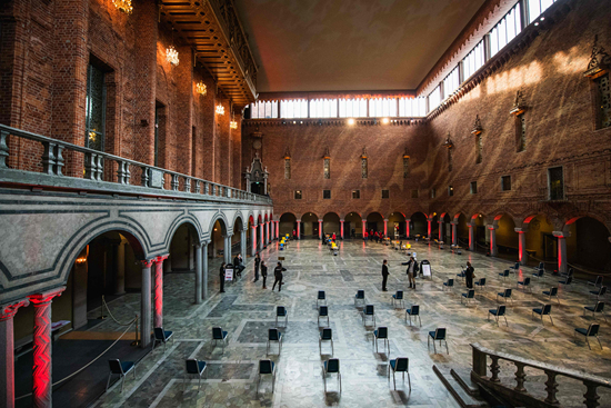 当地时间2月21日,瑞典首都斯德哥尔摩,通常举行诺贝尔奖晚宴的斯德哥尔摩市政厅蓝色大厅被改造成临时新冠疫苗接种中心。这个1500平方米的大厅每年举办瑞典最受欢迎的社交活动,宽阔的空间被认为是接种疫苗的理想场所。人民视觉供图