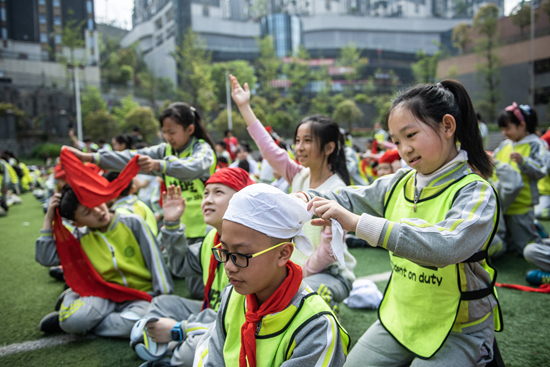 3月29日,贵阳,芳草地国际学校贵阳分校的学生在学习三角巾包扎法。