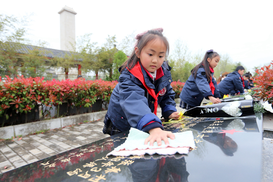 4月1日,在安徽省淮北市相山区烈士陵园,淮北市泉山路学校学生擦拭烈士墓。清明节将至,学校组织学生到烈士陵园开展祭扫活动,重温革命历史,缅怀革命先烈。万善朝/摄(新华社发)