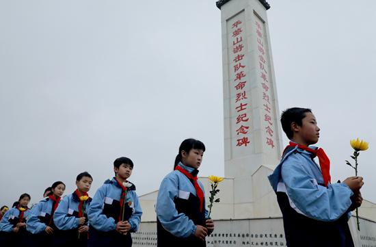 4月1日,四川省华蓥市双河第三小学学生在华蓥山游击队革命烈士纪念碑前开展缅怀先烈活动。周松林/摄(新华社发)
