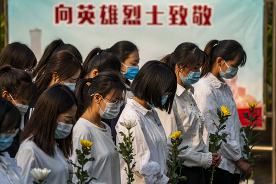 4月1日,云南师范大学师生代表在烈士墓前默哀。新华社记者 江文耀/摄