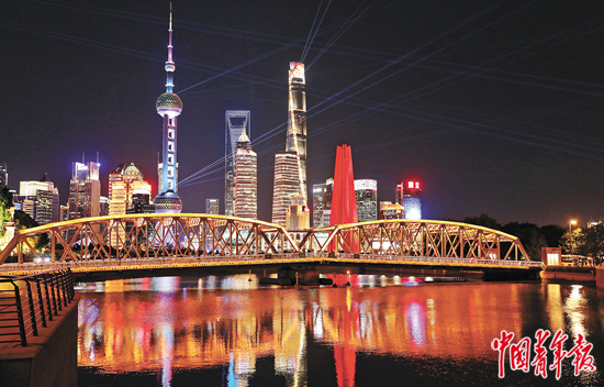 2020年11月3日,上海,第三届进博会召开前夜,黄浦江边流光溢彩。浦西的老铁桥与远处浦东的高楼大厦交相辉映。中青报·中青网记者 李建泉/摄