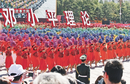 2009年10月1日,首都各界庆祝中华人民共和国成立60周年群众游行,人们高举标语行进在天安门广场。晋永权/摄
