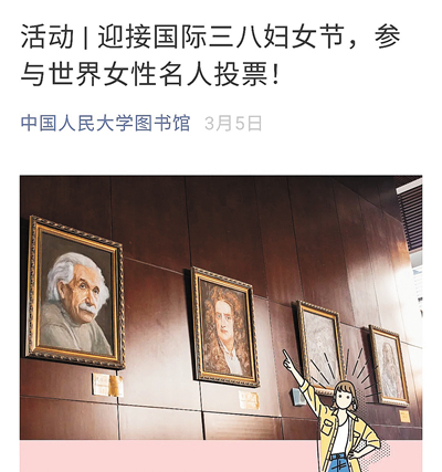 2021年3月8日,在第111个国际妇女节之际,中国人民大学图书馆微信公众号发起了一项投票,为“增加图书馆内女性名人肖像”,征集读者意见。入围女性共16人,她们为人类作出贡献的领域包括文学、艺术、科学、公益等,有李清照、王贞仪、林巧稚,也有阿达·洛芙莱斯、阿加莎·克里斯蒂和蕾切尔·卡逊。