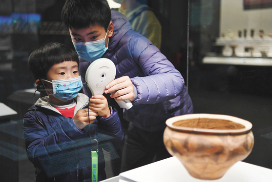 4月5日,小朋友用AR讲解器观看河南博物院展出的“花瓣纹彩陶钵”。