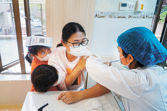 4月5日是清明小长假最后一天,在深圳市坪山区亚迪三村社区健康服务中心,前来接种新冠疫苗的市民络绎不绝,当天该中心完成新冠疫苗接种500剂次。图为小朋友抱着正在接种的家长。朱洪波/人民视觉