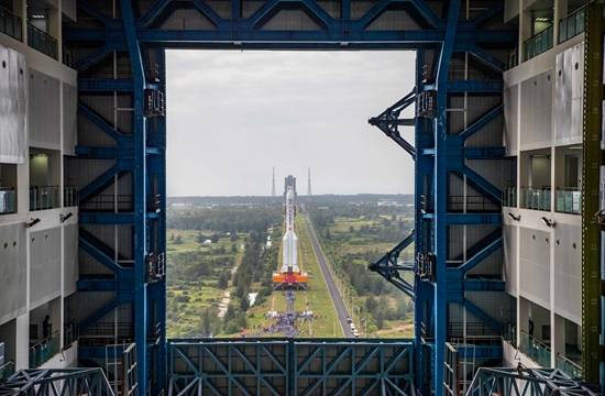 2020年11月17日,长征五号遥五运载火箭和嫦娥五号探测器在中国文昌航天发射场完成技术区总装测试工作后,垂直转运至发射区。人民视觉供图(资料图片)