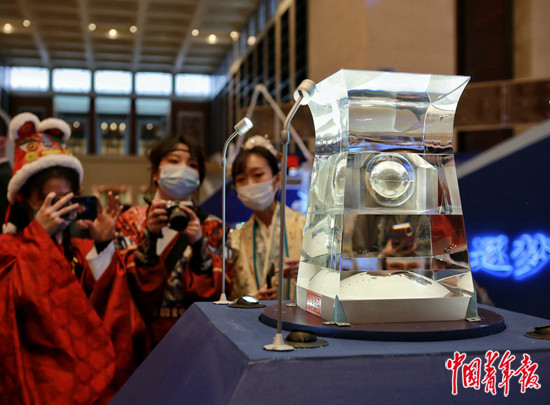 3月2日,北京,几名身穿汉服的青年在中国国家博物馆参观月壤展品。此前几天,“月球样品001号·见证中华飞天梦”展览在国博开幕。中青报·中青网记者 曲俊燕/摄