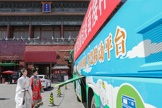 4月13日,准备前往故宫的游客驻足观看停放在路边的移动疫苗接种车。近日,印有“国家免疫计划 智慧移动平台”字样的移动疫苗接种车在故宫博物院东华门外投入使用,为过往人群提供方便快捷的新冠疫苗接种服务。新华社记者 张玉薇/摄