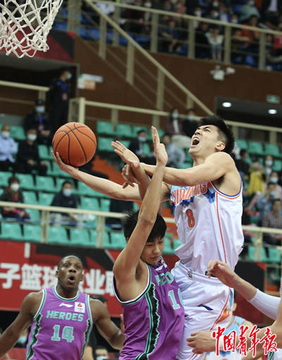 4月18日,浙江诸暨暨阳学院体育中心,新疆队8号唐才育(上)上篮得分。当日,2020-2021赛季中国男子篮球职业联赛的季后赛1/4决赛举行第二场比赛,山东队以105:101战胜新疆队,闯入4强。 中青报·中青网记者 刘占坤/摄